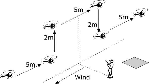 The helicopter takes off from a position five metres in front of the pilot and climbs to eye level, where it hovers briefly. The helicopter, without turning, is then hovered diagonally backwards to a point level with the pilot and five metres to one side and again hovers for a brief period. The model is then hovered forward for ten metres where it again stops and hovers briefly. The pilot then hovers the model, without turning it, sideways for ten metres so that it passes in front of the pilot, ending five metres to the other side of the pilot and ten metres in front. After another brief hover the model moves backwards, without turning, to a point level with and five metres to one side of the pilot where it once more hovers briefly. The model now hovers diagonally forwards toward the original take off point and hovers briefly above the take off point before landing on the original take off pad.