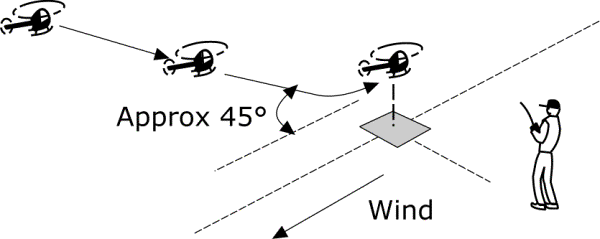 It is not a requirement that this manoeuvre should be entered from full forward flight so the pilot may set up the model in a steady hover or be moving forward in steady hovering flight at a minimum height of fifteen metres and downwind of the landing pad. The model should then sink at a constant rate with constant forward movement at an angle near to 45o, heading down towards the landing pad. Finishing this descent exactly over the landing pad is not required but the model should be no more than a metre or so out. The candidate is allowed a short hover at a height of around half a metre to make corrections before settling the model on the ground.